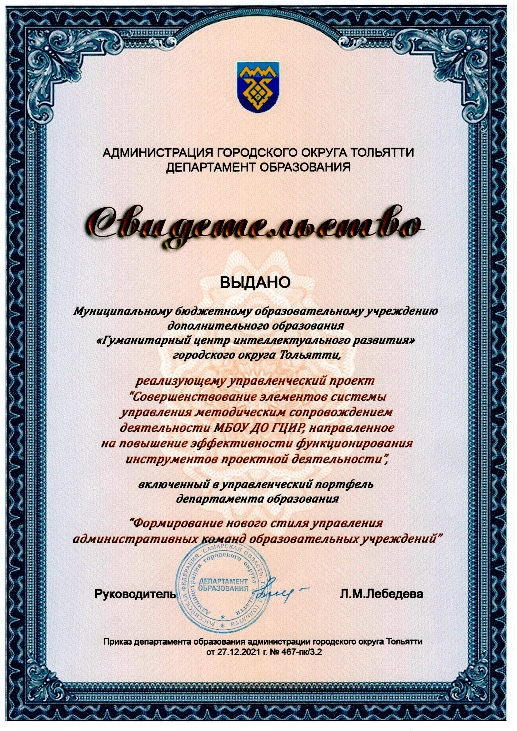 Свидетельство о включении управленческого проекта МБОУ ДО ГЦИР в управленческий портфель департамента образования администрации городского округа Тольятти