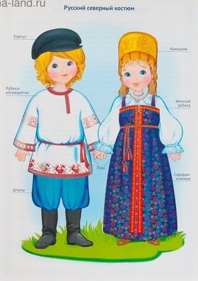 Основные части комплектов пришли из Древней Руси. В женском национальном костюме заложены представления того времени о женской красоте и семейных ценностях. Силуэт прямой или расширенный вниз, подчеркивать фигуру было не принято, для национального комплекта характерна многослойность.
