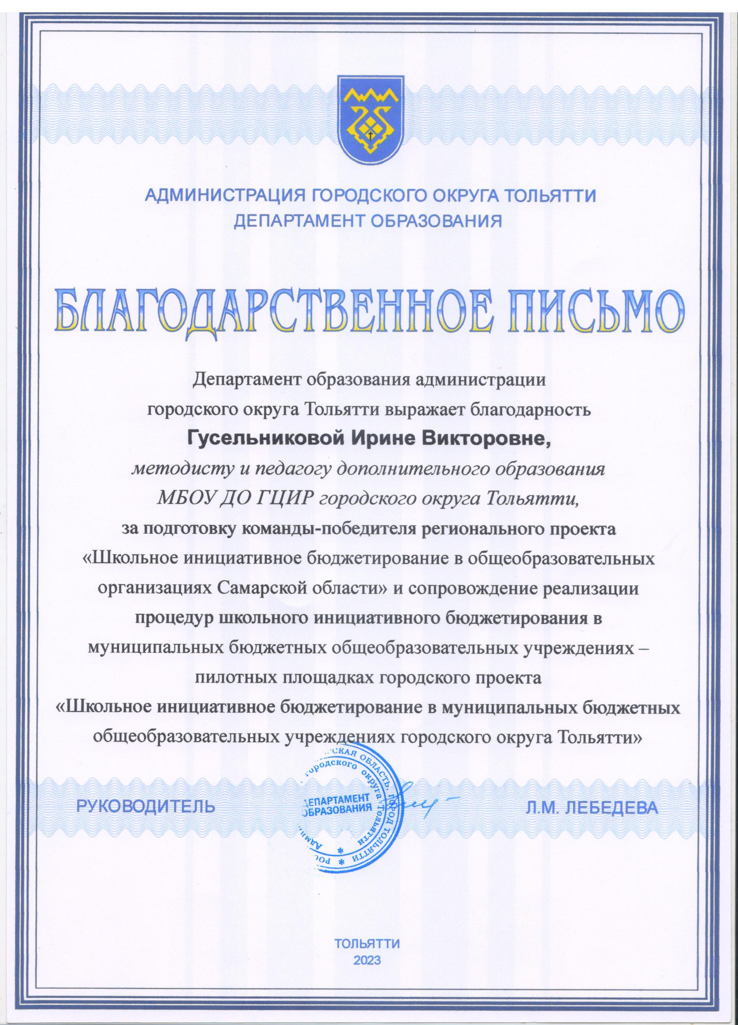 В 2023 году в целях вовлечения обучающихся муниципальных бюджетных общеобразовательных организаций г.о.Тольятти в решение вопросов расходования части средств школьного бюджета Ирина Викторовна приняла активное участие в организации работы по реализации процедур школьного инициативного бюджетирования на пилотных площадках г.Тольятти, обеспечила информационно-методическое сопровождение участников проекта.