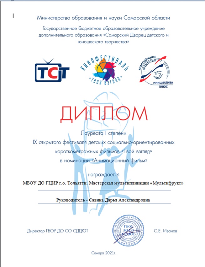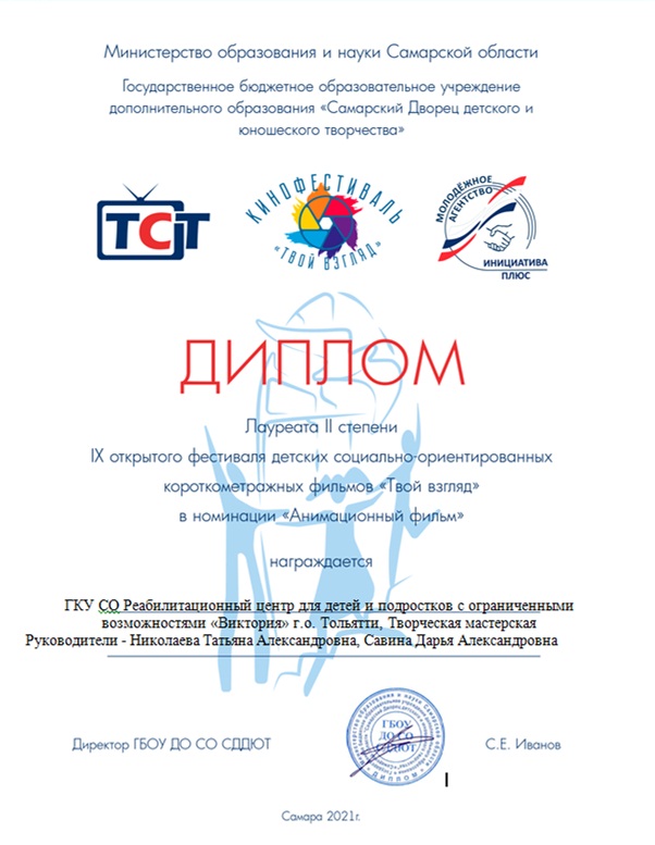 Городской фестиваль экранных искусств "Зазеркалье": диплом 2 место в номинации "Анимационный фильм"; Областной фестиваль детских социально-ориентированных фильмов "Твой взгляд": диплом лауреата 1 степени в номинации "Анимация" Международный конкурс-кинофестиваль "Свет миру. Дети - 2021": поощрительный диплом за фильм "Наш дом" |