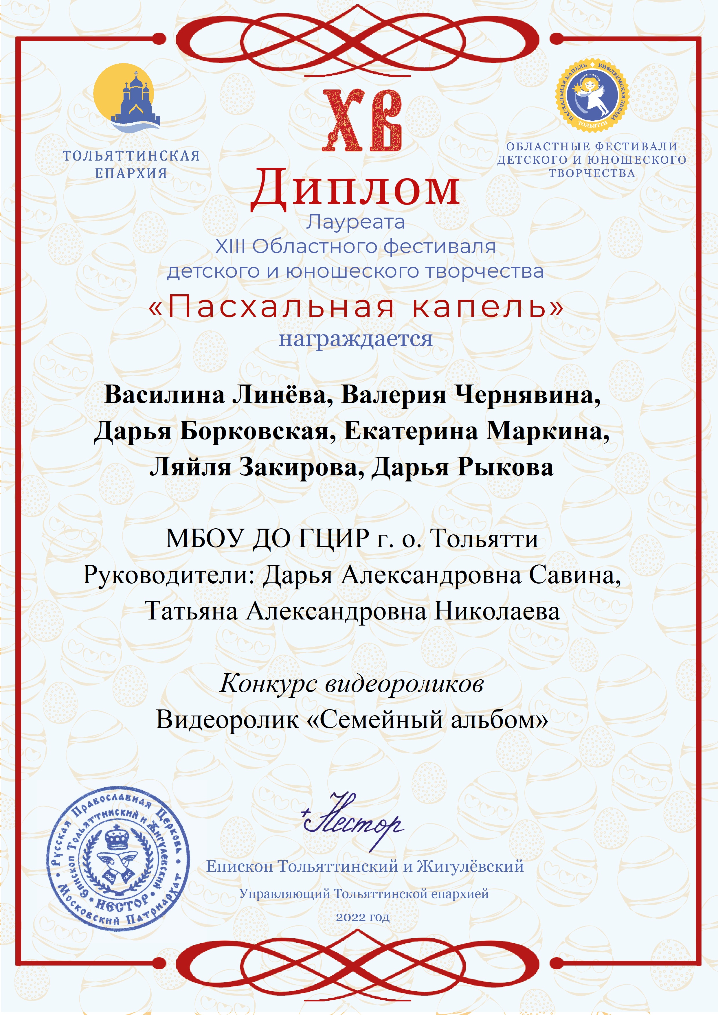 Областной XIII фестиваль детского и юношеского творчества "Пасхальная капель": диплом лауреата. Международный конкурс кинофестиваля "Свет миру. Дети 2022": диплом лауреата 1 степени |